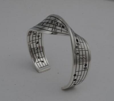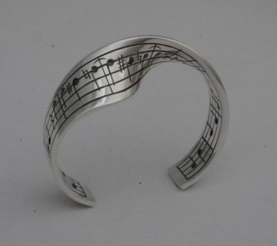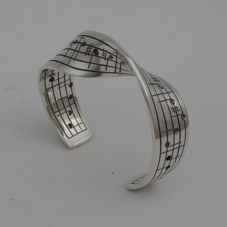 The form of this bracelet is that of a moebius strip. Both inside and outside surfaces are carved with music staffs and quote a unique melody by J. S. Bach that is played both forwards and exactly backwards (retrograde motion). All of the notes line up side for side, and those lasting two beats (half notes) are drilled right through. Although the moebius shape turns the "page" upsidedown, the melody within its staff itself remains right side up.