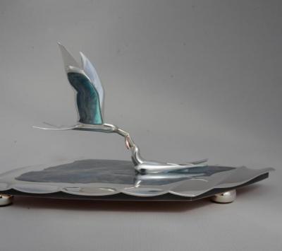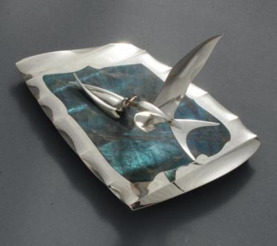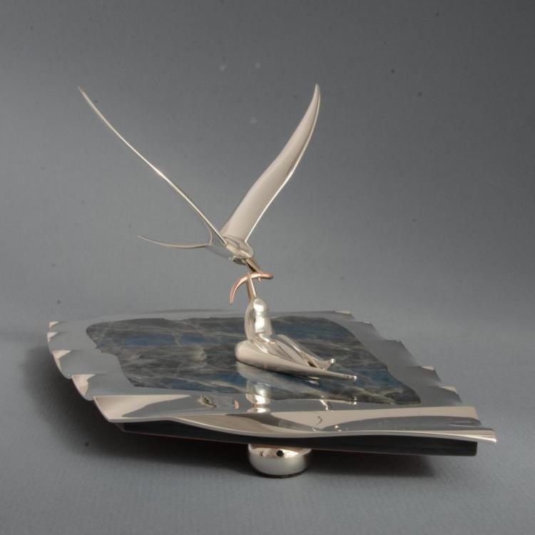 Labrador Wave is now part of the permanent collection at The Rooms, Newfoundland and Labrador's provincial art gallery. The birds, Arctic Terns, nest in Newfoundland, and the slice of labradorite stone with its unique wave-like iridescence is from Labrador.