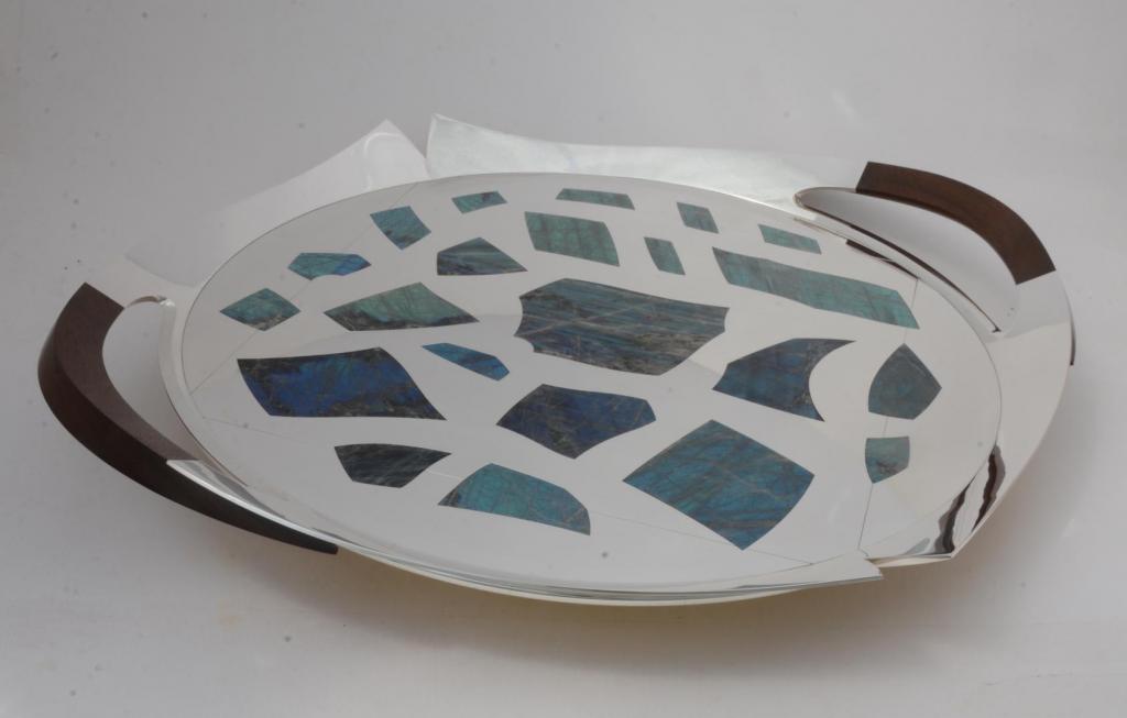 This Tray was commissioned to accompany my 4-piece Sterling Silver Tea Service. The iridescence of all 22 slices of labradorite is oriented in the same direction and, even when not catching the light from other angles, some of their beautiful blue will be reflected in the underside of the Tea Service itself.