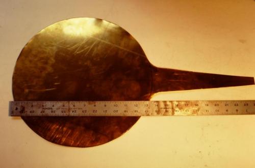 The red brass disc with its handle cut from a single 14 guage sheet (1/16" or 1.75 mm. thick). The diameter of the circle is 14", and the overall length including the handle is 24".