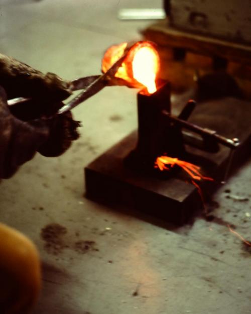 Pouring the molten silver into an ingot mold.