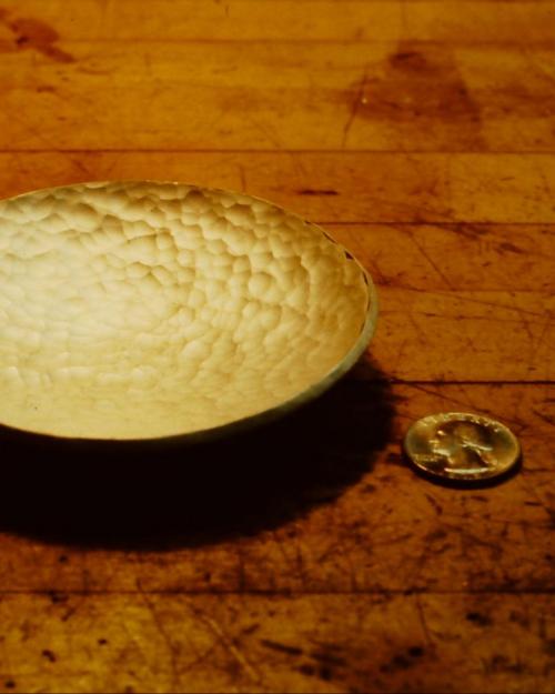 The flared stem, planished, filed smooth and partly polished. All cuttings and filings left over from having created the bowl and stem are re-melted and poured to create another small ingot.