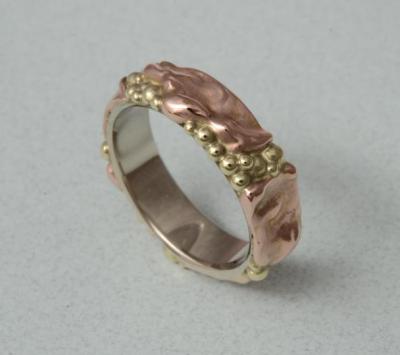 This wedding band was made to match the Ruby ring in rose and green gold (next item in the row of ring photos). In both cases, the customer had requested something textural or gnarled or "Medieval" in character.